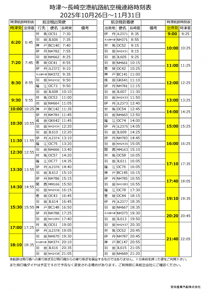 | 時津発 | 空港着 | 空港発 | 時津着 |