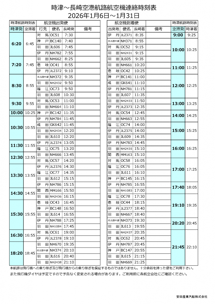 飛行機の遅延などにより長崎空港発の便を遅らせる場合があります。