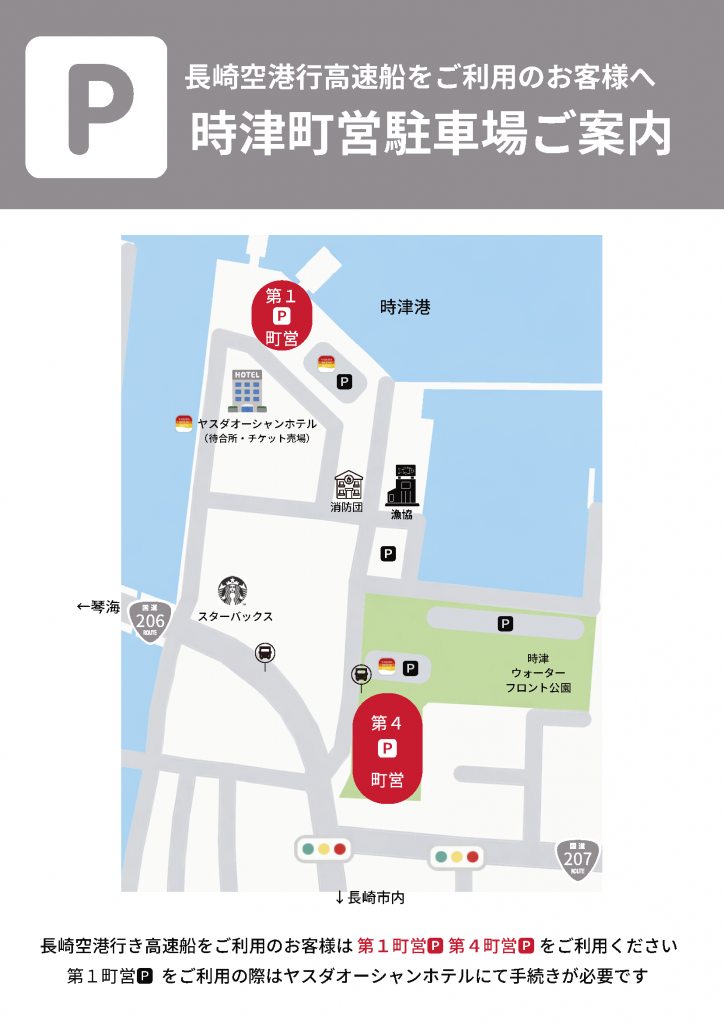 ※時津ウォータフロント公園無料駐車場は公園利用者専用です。高速船利用のお客様の駐車はご遠慮ください。